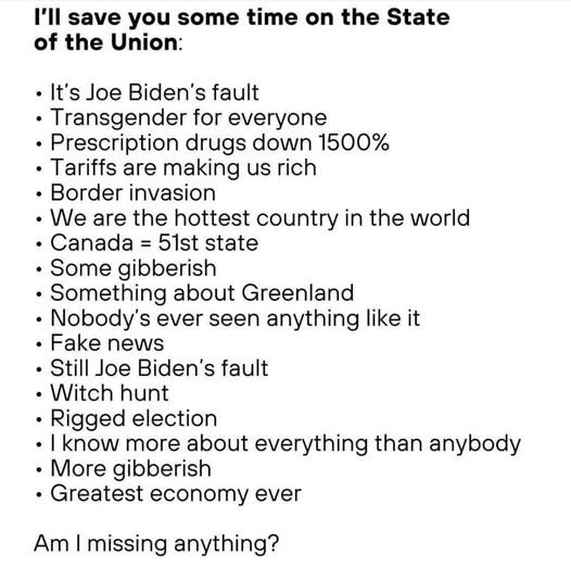 For the first time in my life I WILL NOT be watching the State of the Union speech presented by Donald Trump. The speeches have been boring. The words of Trump and Biden have no connection with reality. I might as well watch “Gone with the Wind.” At least the ending of that says it all. “Frankly I don’t give a damn.”