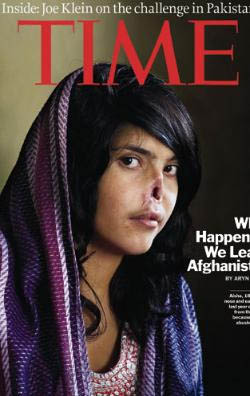 The cover of the Aug. 9 issue of Time Magazine shows a photo of Aisha, an 18-year-old Afghan woman whose nose and ears were cut off in 2009 under orders from a local Taliban commander as punishment for fleeing her husband’s home. (Jodi Bieber, Institute for Time Magaizne/AP)