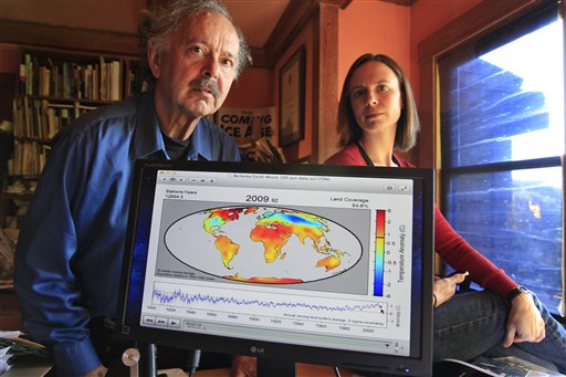 In this Friday, Oct. 28, 2011 photo, Richard Muller, left, and his daughter, Elizabeth Muller, right, pose with a map from their study on climate at their home in Berkeley, Calif. A new study of Earth’s temperatures going back more than 200 years finds the same old story: It’s gotten hotter in the last 60 years. What’s different is the scientist behind the latest study, Richard Muller. The California physicist was doubtful of what climate scientists have been saying – until he did his own research, partly funded by climate change skeptics. Elizabeth Muller, co-founder and executive director of the Berkeley Earth Surface Temperature Study, ran the study. (AP Photo – Paul Sakuma)