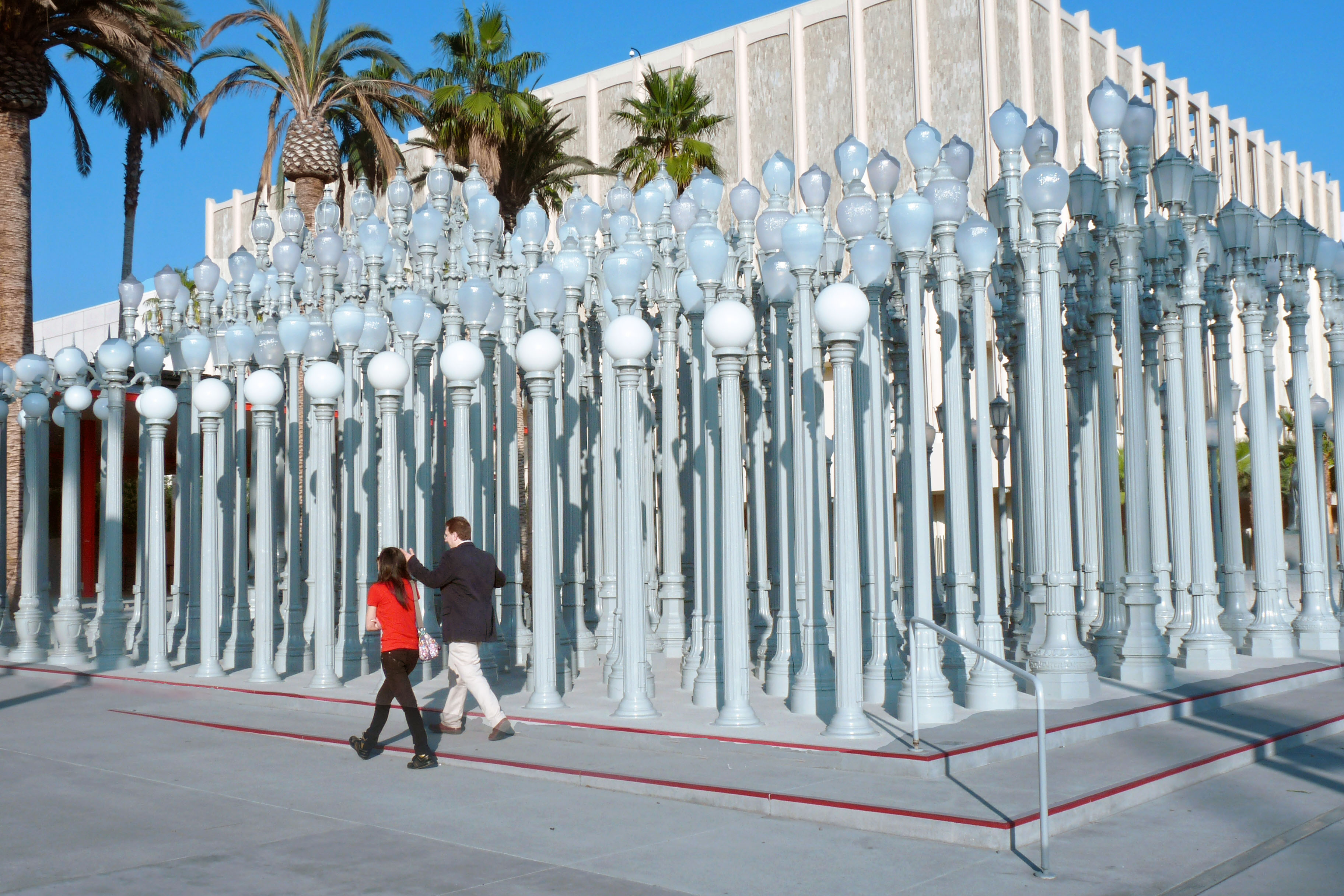 Artist Chris Burden was the creator of this amalgamation of Los Angeles city street lights.  The lights really do turn on every night.  Mr. Burden collected and restored dozens of city street lamps at his Topanga Canyon studio. Eventually they became his installation at LACMA (Los Angeles County Museum of Art).