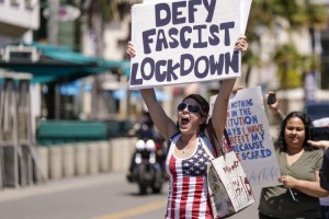 Meanwhile just 40 miles away in Orange county California (really part of metropolitan Los Angeles) a group of more than 100 protesters converged on Huntington Beach on Friday in a demonstration against California’s coronavirus stay-at-home rules, part of a series of national demonstrations organized by conservative groups. One demonstrator carried a “Live Free or Die” banner and another reading “Defy Fascist Lockdown.”