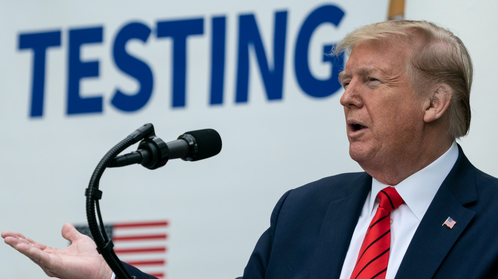WASHINGTON, DC – MAY 11: U.S. President Donald Trump speaks during a press briefing about coronavirus testing in the Rose Garden of the White House on May 11, 2020 in Washington, DC. Several White House staff members and aides have recently tested positive for the coronavirus and three top health officials from the White House coronavirus task force are now self-quarantining after potential exposure. (Photo by Drew Angerer/Getty Images)