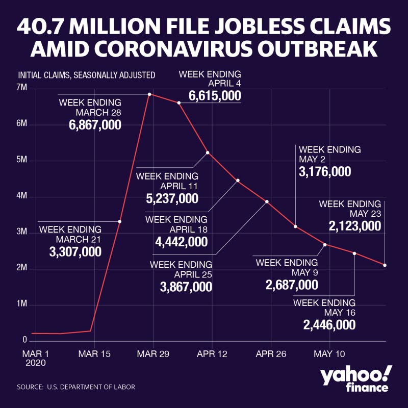 This graph shows the weekly new jobless claims. Prior to the Coronavirus Outbreak weekly claims were about 212,000 and the unemployment rate was 3.5%.