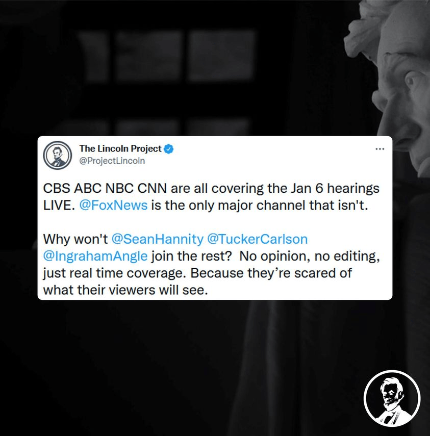 Fox News is the only major network that will not cover the January 6th Committee hearings live. It’s almost as if they don’t want their audience to see something.