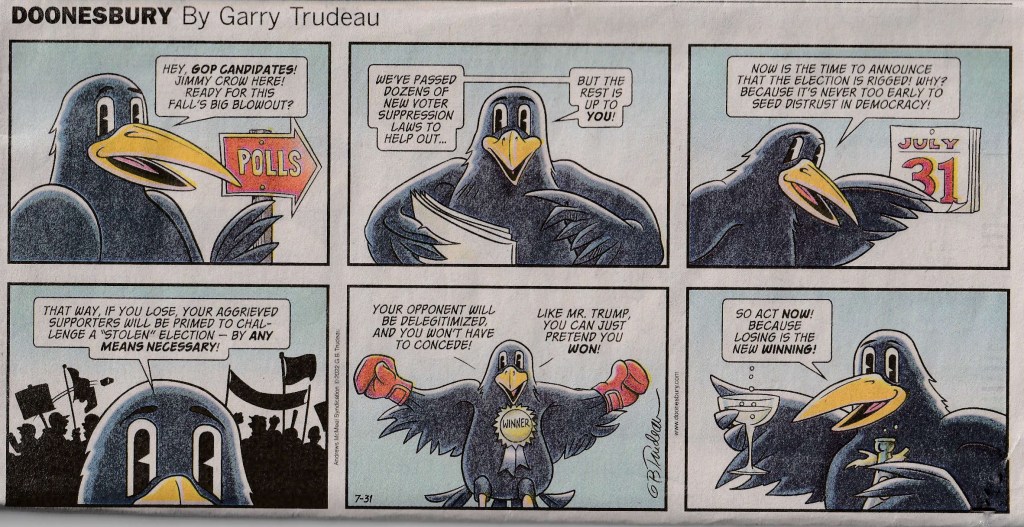 Today in the Los Angeles Times Garry Trudeau hits the mark. He correctly says “Now is the time to announce that the election is rigged.”