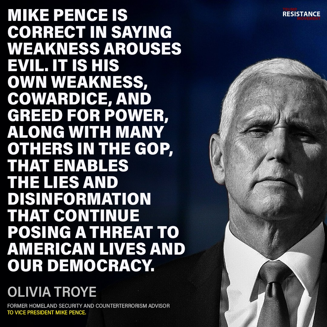 Former Vice President agreed to an interview for Meet the Press. The surprise in the interview was that it was a replica of Jake Tapper’s interview on CNN. Pence had the words memorized and spoke them in an almost robotic way. Other than Pence’s strong religious beliefs he showed his lack of ability to convey a thought of his own. In that robotic voice he praised Trump’s daily non-sensical COVID reports. Olivia Troye accurately defined Mike Pence.