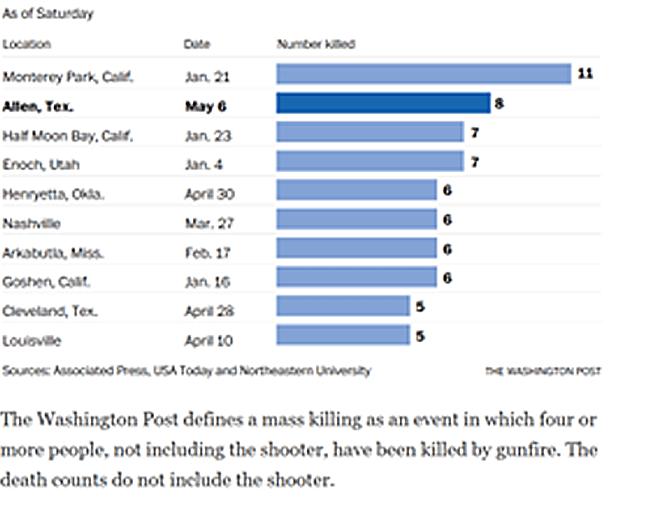 Deadliest mass killings in the U.S. in 2023 coastcontact Uncategorized May 8, 2023 1 Minute Share this: Click to share on Facebook (Opens in new window) Facebook Like Loading... Published by coastcontact I am a somewhat cranky but mostly optimistic 65 plus who refuses to give up on this maddening world. The purpose of this BLOG is to express my feelings, thoughts. View all posts by coastcontact Published May 8, 2023
