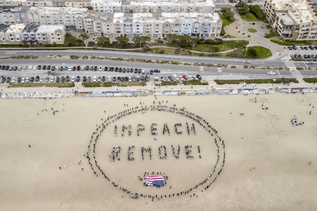 Happily I am not alone. Protestors form a “Impeach and Remove” human banner on Ocean Beach during a protest against U.S. President Donald Trump, in San Francisco, Saturday April 19, 2025. Photo taken by San Francisco Chronical via AP