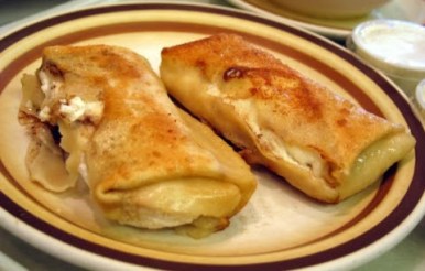 Blintzes  Not to be confused with the German war machine’s ‘blintzkreig.’ Can you imagine the Jerusalem Post in ’39 with huge headlines announcing: ‘Germans drop tons of cheese and blueberry blintzes on Poland. Shortage of sour cream expected’? Basically, this is the Jewish answer to Crepe Suzettes. They are actually offered on the menu at the local International House of Pancakes, but no one there knows what the hell they are. In ignorant bliss, they often serve them frozen from the blintz factory. No modern woman will take time to make them if she can find a grocery store selling frozen ones (assuming she can find someone in that store who knows where they are kept).