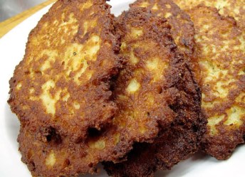 Note: Eggs are not necessary since the potatoes will bind the pancake when they cook. Also it is not necessary to fry it in much oil. Use Pam or the like or a Teflon pan.