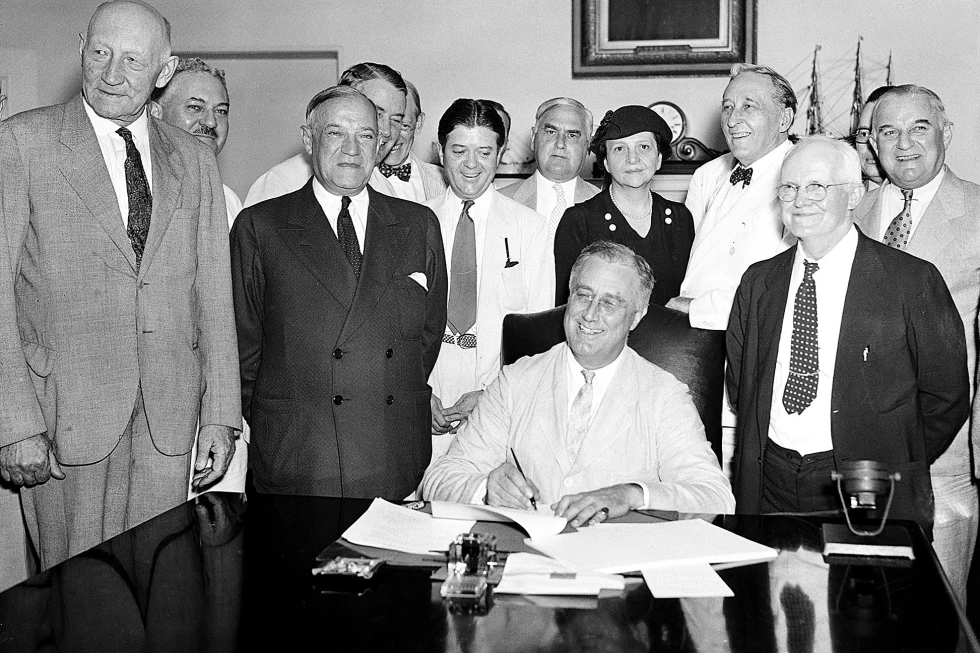 On Aug. 14, 1935, President Franklin D. Roosevelt signed the Social Security Act into law, ensuring income for elderly Americans and creating a federal unemployment insurance program.