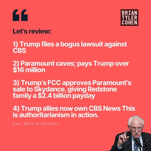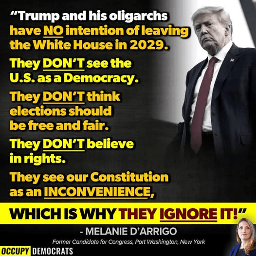 The Supreme Court declared Trump above the law. He’s threatening to arrest political opponents. He’s already sent the FBI after elected officials when they haven’t committed crimes. Congress is his. Most state governments are his. Billionaire oligarchs openly coordinate with him.