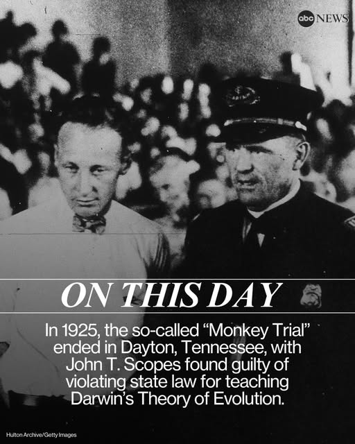 ON THIS DAY: One hundred years ago, the so-called “Monkey Trial” ended in Dayton, Tennessee, with John T. Scopes found guilty of violating state law for teaching Darwin’s Theory of Evolution.