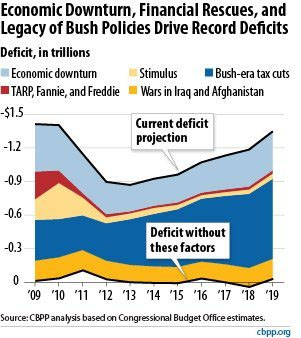 That big blue chunk represents the Bush tax cut portion of the deficit. The yellow represents the wars. The light blue is the tax revenue lost to the recession. And those really narrow tan and red strata are TARP and the stimulus. Clearly we need to elect more Republicans so they can make permanent the big thick deficit hogs and kill that thin section for the stimulus.