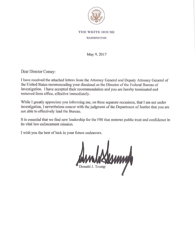 James Comey was the Director of the FBI since September 4, 2013. Mr. Comey learned of his dismissal while in Los Angeles. Here is the letter that informed Comey of his immediate dismissal.