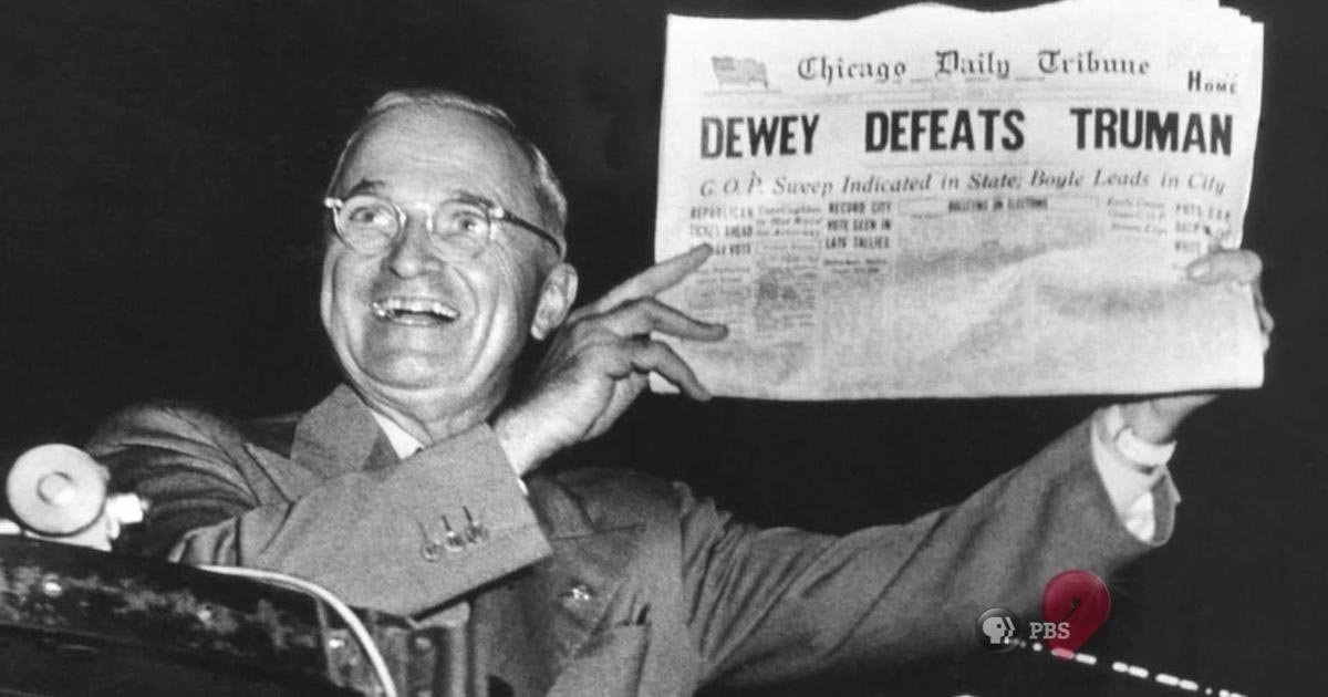 From history.com Heading into Election Day on November 2, 1948, it seemed like Thomas Dewey had the U.S. presidency in the bag. Numerous polls and pundits predicted a win for the Michigan native, New York governor and prominent gang-busting attorney. But, as a now-famous photograph would show, everyone—including the editors of the Chicago Tribune—got it wrong. The surprise victory of the plain-spoken Democratic nominee, Harry S Truman, would become one of the biggest upsets in U.S. presidential history—and it would forever be memorialized, thanks to an embarrassing newspaper gaffe.
