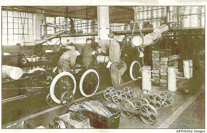 IN 1914, HENRY FORD more than doubled factory workers’ minimum pay so they could afford to buy Ford cars. Above is the Highland Park plant in 1913.